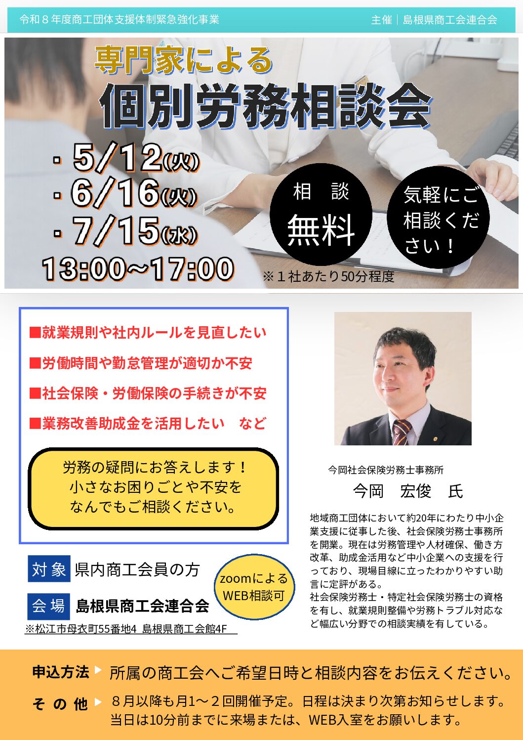NEW 2026-04-23 【専門家への無料相談】個別労務相談会 【申込方法】商工会本支所までお申し込みください 大社 53-2558 多伎 86-3467 佐田 84-0508 湖陵 43-1344